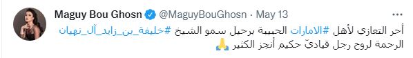 فور إعلان وزارة شؤون الرئاسية في دولة الإمارات العربية وفاة رئيس دولة الإمارات صاحب السمو الشيخ خليفة بن زايد آل نهيان حتى صدرت الرسائل التعزية من الملوك والأمراء حكام ورؤوساء العالم كما ضجت مواقع التواصل الإجتماعي برثاء القائد والرئيس دولة الإمارات بكلمات مؤثرة ومن بينهم نجوم العرب وعلى رأسهم إبنة دولة الإمارات النجمة أحلام التي نشرت غردت وأعادت نشر تغريدات لقادة دولة الإمارات والعالم الذين نعوا صاحب السمو الراحل الشيخ زايد بن خليفة آل نهيان.